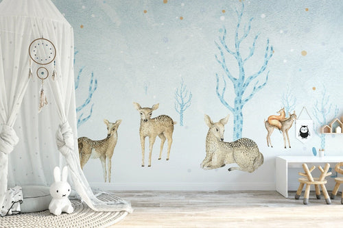 Forest blue and deer baby room wallpaper