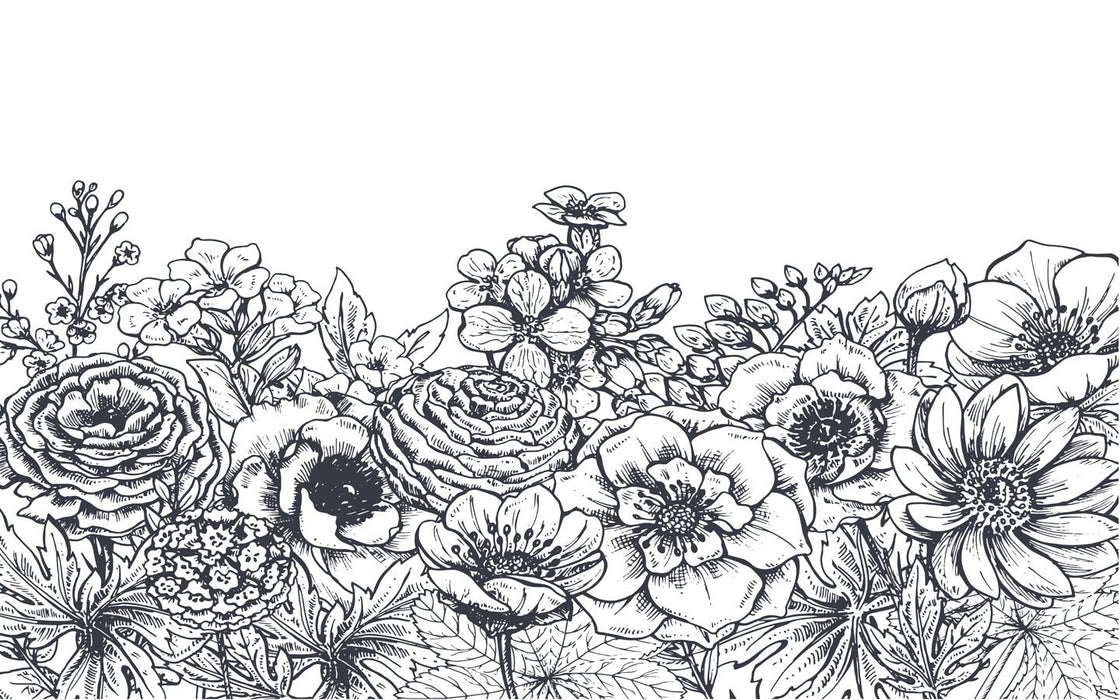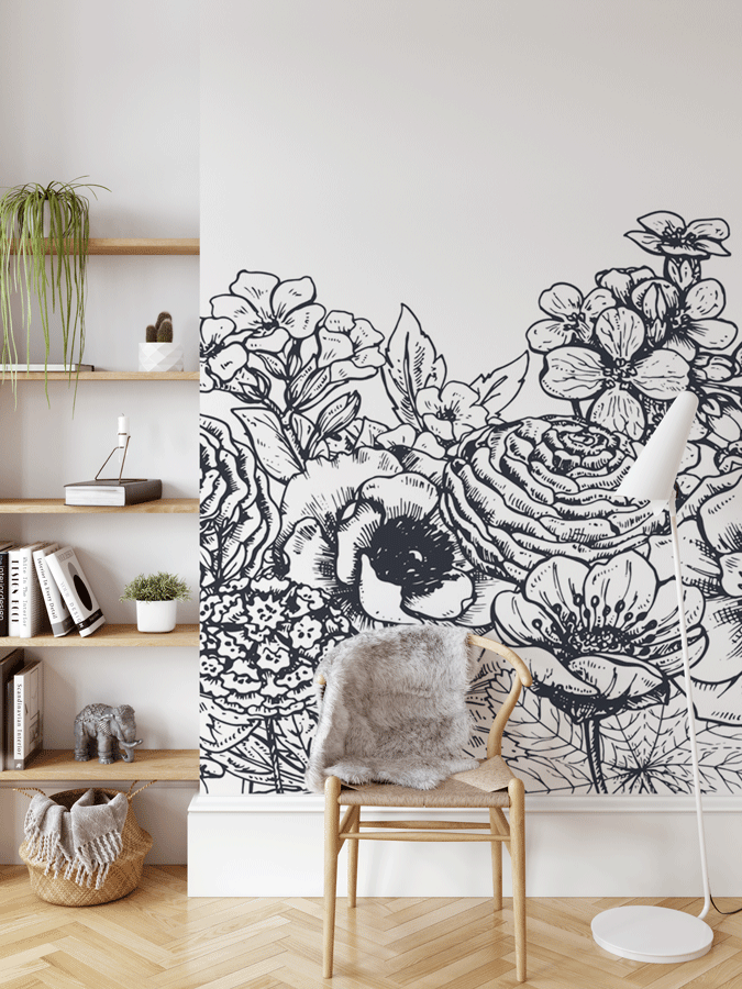 Cette tapisserie sur mesure dévoile un somptueux bouquet floral illustré en noir et blanc, inspiré de la gravure d’art et du dessin botanique.
