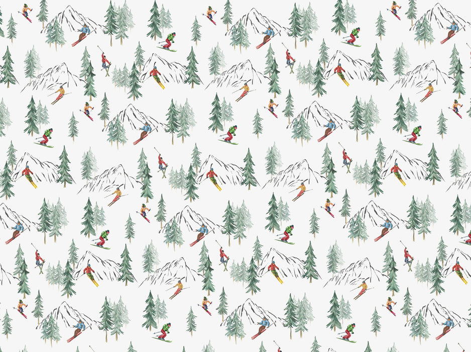 Discover mountain sports with our Alpine glisse wallpaper. Representing winter sports with its skiers and fir trees, this panoramic wallpaper will find its place in every room of your home, but also in your establishment or chalet.