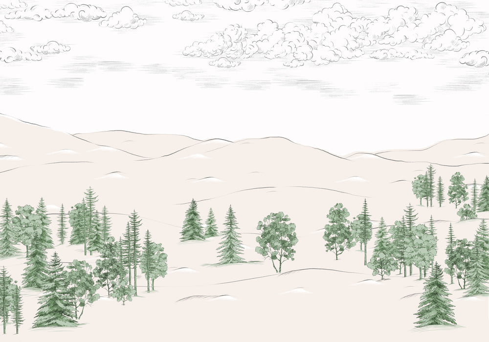 Immerse yourself in the enchanting atmosphere of the peaks with our "Esquisse des Cimes" panoramic wallpaper in a two-tone forest green and beige linen version. This French creation, crafted with care and passion, captures the majesty of the mountains with pencil drawings of trees, beech trees and clouds intertwined in shades of beige and forest green.