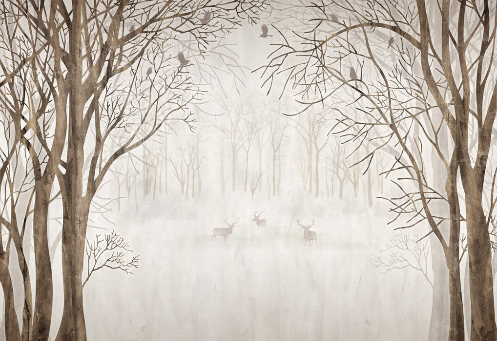 Immerse yourself in a forest getaway with our "Forêt Bienvenue dans les Bois" custom panoramic wallpaper, offering a fairytale landscape in brown and beige tones. Minimalist yet strikingly realistic, this mural will captivate your guests with its originality. Create a peaceful, luminous atmosphere with this custom-made mural, ideal for both large and small rooms.