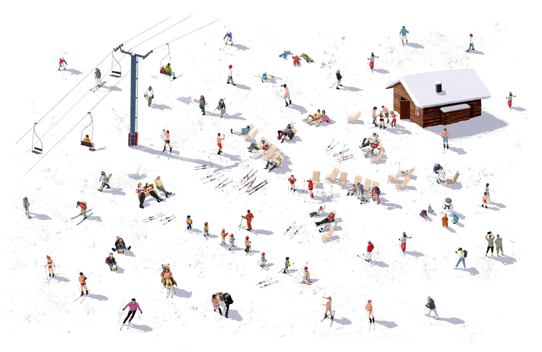Invite the magic of the Alps into your home with this illustrated mountain wallpaper, perfect for capturing the joyful, nostalgic essence of après-ski. Between sunbathing skiers, moving gondolas, children atski school, tobogganing and groups of friends sharing a hot chocolate or a moment at the bar, every detail exudes conviviality and precious memories of mountain vacations.
