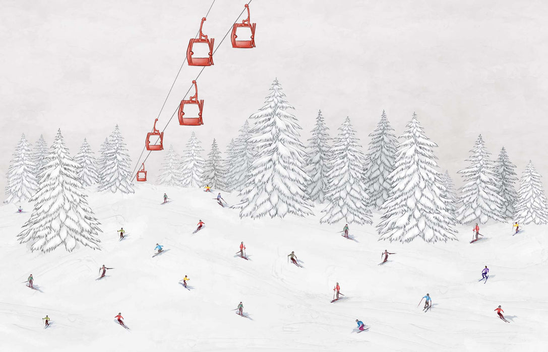 This wall design features mountains, snow and a light misty sky, with gondolas in peppy colors, and skiers just the way we like them.