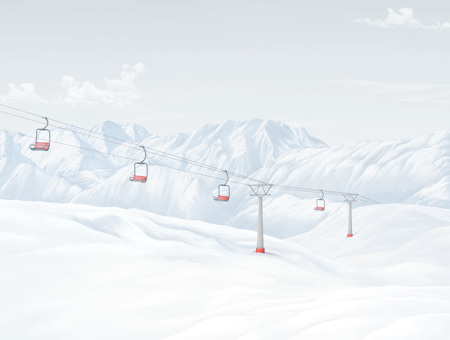 The red gondolas, gracefully suspended in a winter panorama, are evoked with artistic finesse. The delicate use of white creates a striking contrast, capturing the pure brilliance of the immaculate snow while giving way to a feeling of space and lightness.