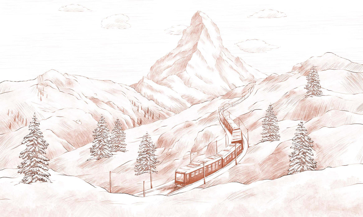 Do you recognize this pyramid-shaped mountain, this rocky tooth that pierces the sky? Discover the timeless elegance of Mont Cervin, captured to perfection in our panoramic Mont Cervin terracotta wallpaper drawn in fine pencil. Every detail of this majestic mountain in the Swiss Alps has been meticulously reproduced by our talented artists, creating a work of wall art of incomparable beauty.