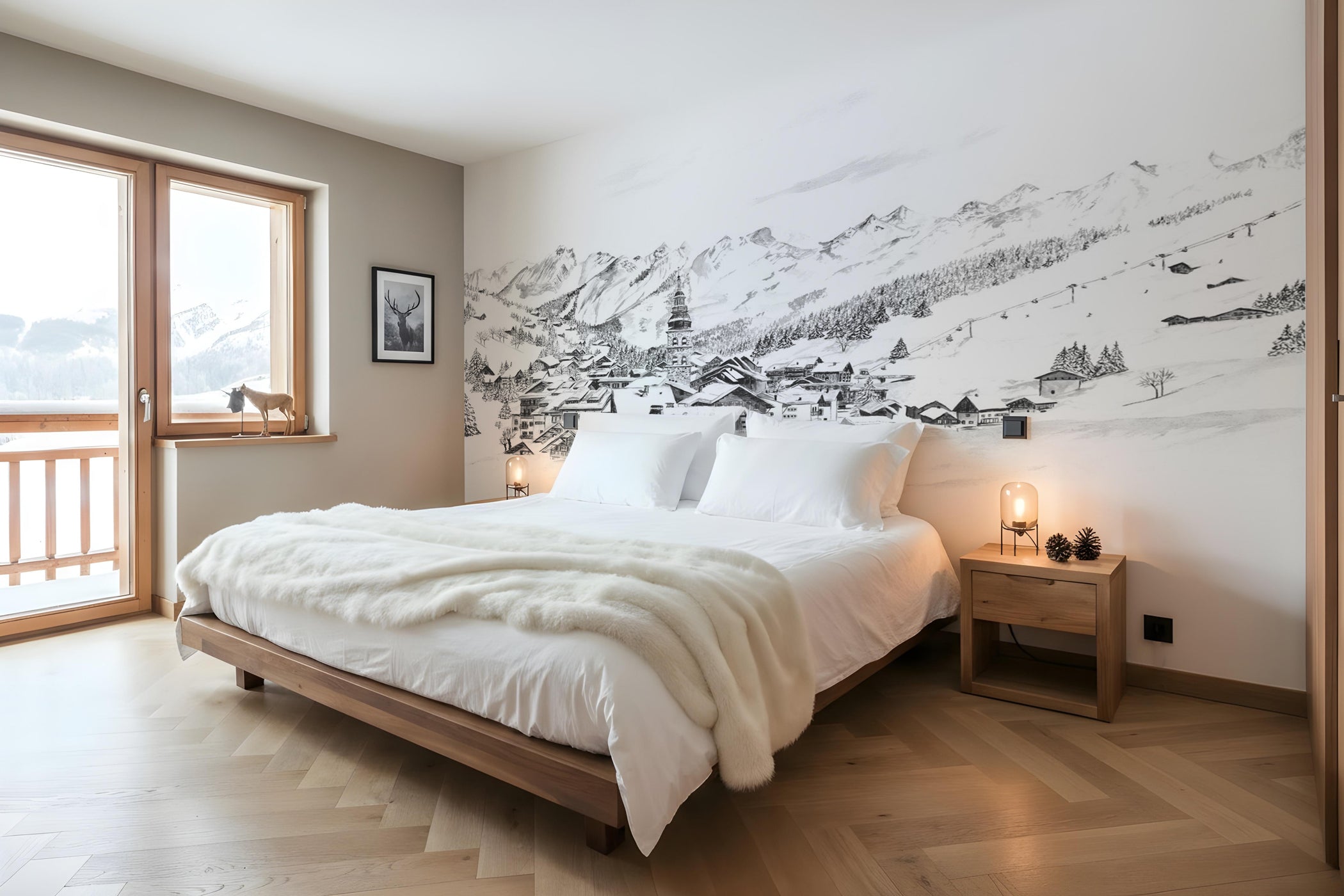 À l’arrière-plan, la chaîne des Aravis déploie ses sommets enneigés dans une composition profonde et immersive. Son style aquarelle élégant, signé par l’artiste Flora Lacour Folliol, mêle douceur, poésie et réalisme. Les teintes naturelles et l’esprit authentique de la montagne créent un décor chaleureux, idéal pour une ambiance chalet chic ou scandinave.