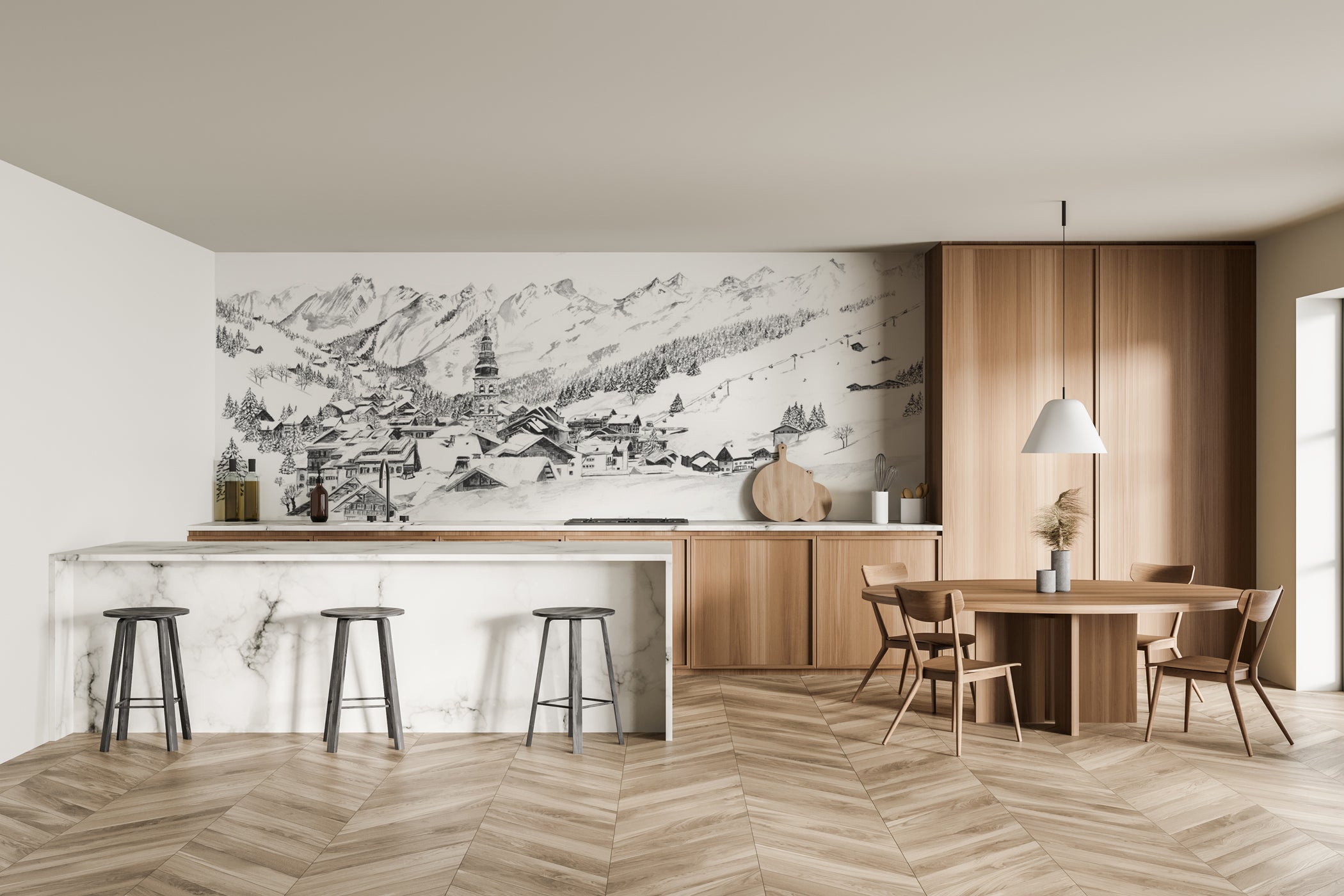 Sublimez votre intérieur avec ce papier peint panoramique montagne d’exception, inspiré du décor emblématique de La Clusaz, l’une des plus belles stations des Alpes françaises. Cette fresque murale grand format révèle un paysage alpin majestueux : chalets savoyards, toits enneigés, reliefs lumineux et la silhouette raffinée de l’église traditionnelle, le tout illustré avec une précision artistique remarquable.