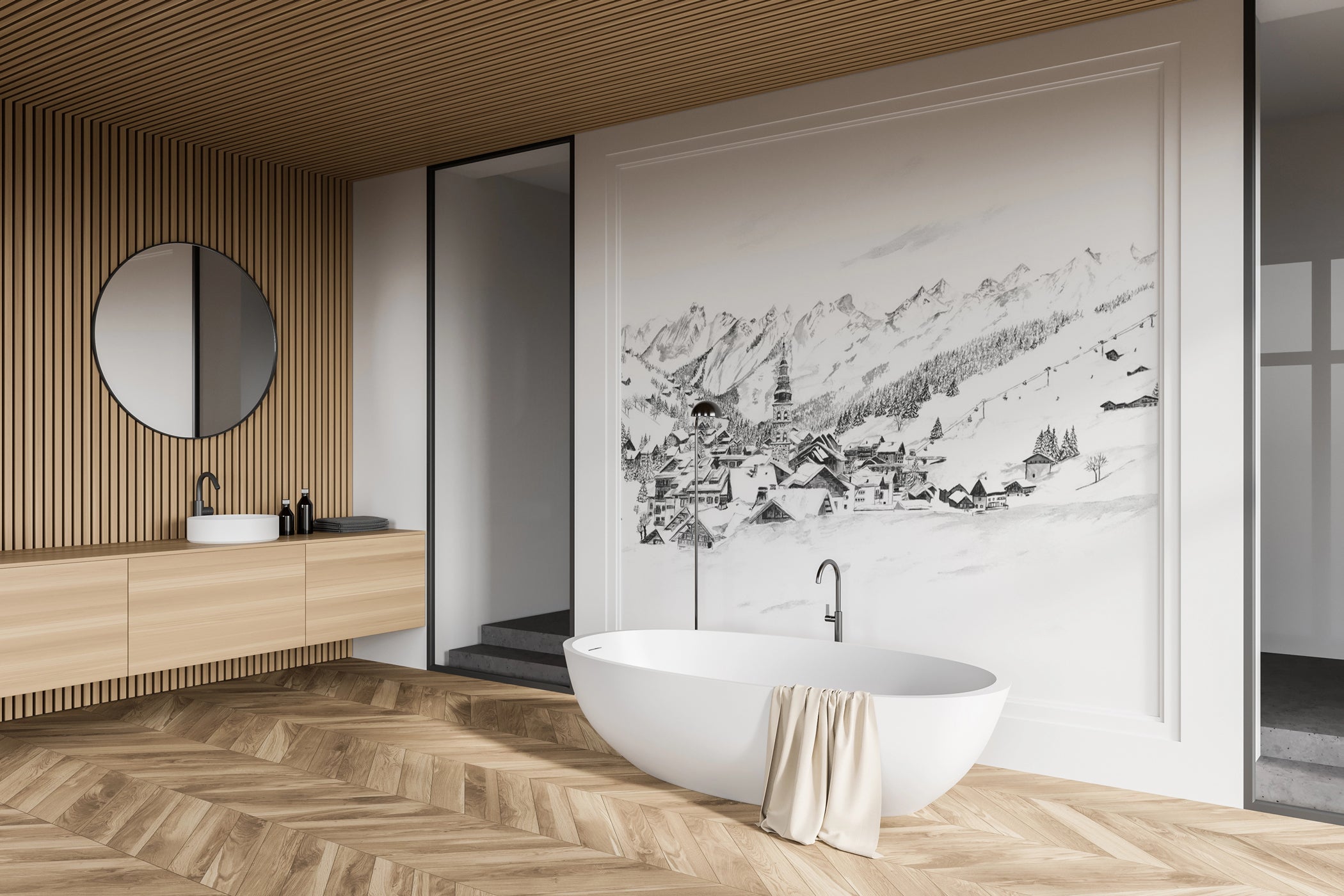Papier peint panoramique La Clusaz en peinture - Noir et blanc