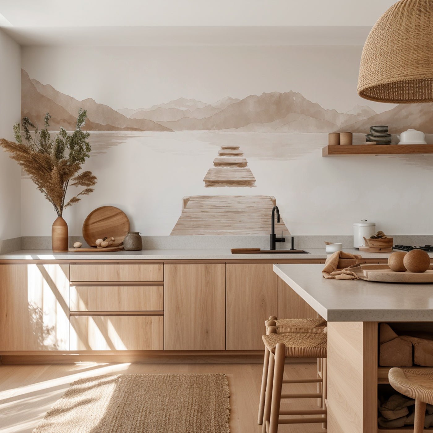 Apportez une touche de sérénité et d’élégance à votre intérieur avec ce papier peint panoramique représentant un ponton en bois s’étirant sur les eaux calmes du lac d’Annecy, au cœur des majestueuses Alpes françaises. Inspiré par les paysages naturels d’Annecy, ce décor mural immersif associe la douceur d’un tableau aquarelle aux tons neutres, pour créer une ambiance zen et raffinée dans votre salon, chambre ou bureau.
