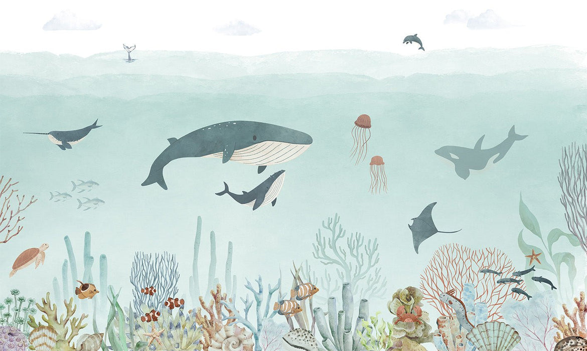 Immerse your baby's room in a soothing marine world with our blue whale baby wallpaper. Designed to create a serene and comforting ambience, this baby wallpaper with whale motifs and blue hues is perfect for creating a welcoming and stimulating environment for your little one.