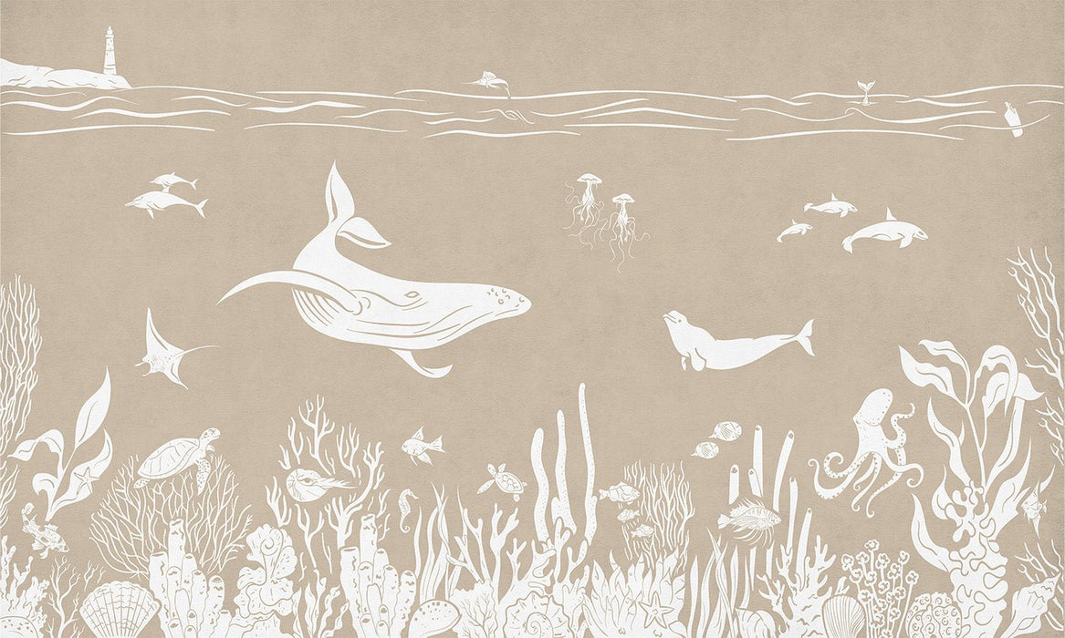 Your baby's or child's bedroom is transformed by our beige aquatic stroll wallpaper. This monochrome beige pastel wallpaper softens and soothes the atmosphere in your child's room. Ideal for supporting your child's development and awakening, this children's sea animal wallpaper tells tender stories. Let's plunge together between dolphins, whales, fish and corals to marvel and learn while having fun.