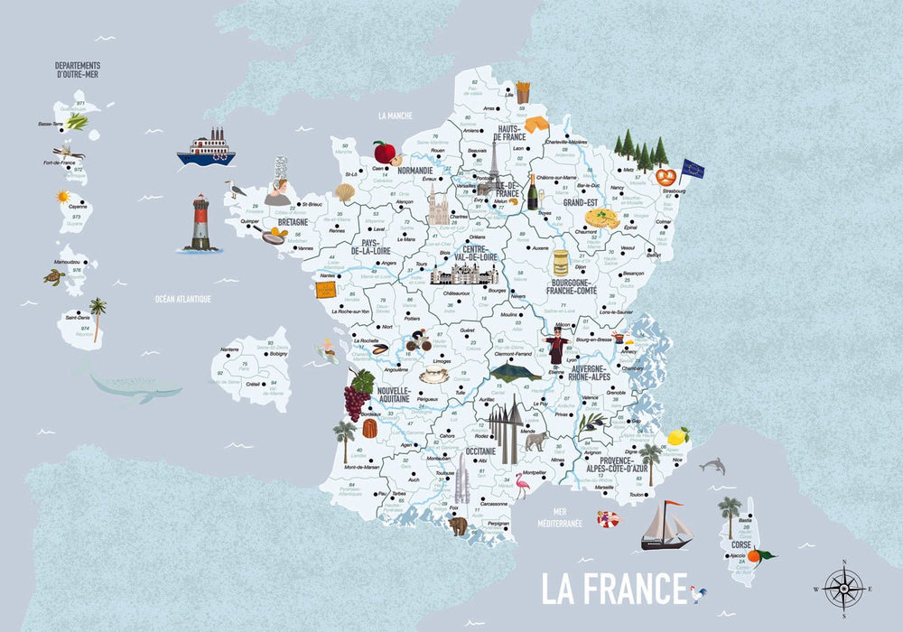 Discover our blue children's map of France wallpaper. This map of France is an easy way for young and old to learn about the geography of France. This illustrated world map wallpaper lets you learn about the specialities of regions or departments. A fun, easy-to-learn and beautifully illustrated wallpaper that highlights all the riches of France: monuments, food, mountains, rivers, departments... How can you resist this carte de France wall mural? This panoramic mural is in a soft, Scandinavian style, available in three colors. It's ideal for creating a relaxing, sleep-inducing atmosphere, but also for facilitating learning and inspiring the whole family to discover the four corners of France. It's easy to create a unique decor with this made-to-measure wallpaper! We're sure you'll love it. All our wallpapers are Eco-friendly, Kids Friendly. They're environmentally friendly and kind to interiors. Place this panoramic carte de France wallpaper in your child's bedroom, playroom or classroom! Children will be amazed.