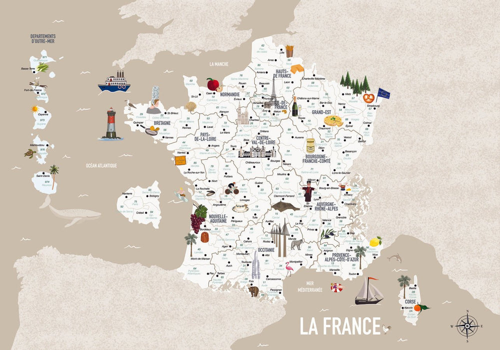 Discover our beige children's map of France wallpaper. This map of France is an easy way for young and old to learn about the geography of France. This illustrated world map wallpaper lets you learn about the specialities of regions or departments. A fun, easy-to-learn and beautifully illustrated wallpaper that highlights all the riches of France: monuments, food, mountains, rivers, departments... How can you resist this carte de France wall mural? This panoramic mural is in a soft, Scandinavian style, available in three colors. It's ideal for creating a relaxing, sleep-inducing atmosphere, but also for facilitating learning and inspiring the whole family to discover the four corners of France. It's easy to create a unique decor with this made-to-measure wallpaper! We're sure you'll love it. All our wallpapers are Eco-friendly, Kids Friendly. They're environmentally friendly and kind to interiors. Place this panoramic carte de France wallpaper in your child's bedroom, playroom or classroom! Children will be amazed.