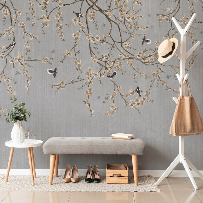 Delicate magpies add a charming touch to these branches, while the delicate blossoms bring a refined, floral ambience to your space. This flowering branches wallpaper instantly transforms your room into an artistic canvas, bringing both visual dimension and a subtle touch of nature. The background color of the wallpaper has a visual texture, to bring a retro touch to your decor.
