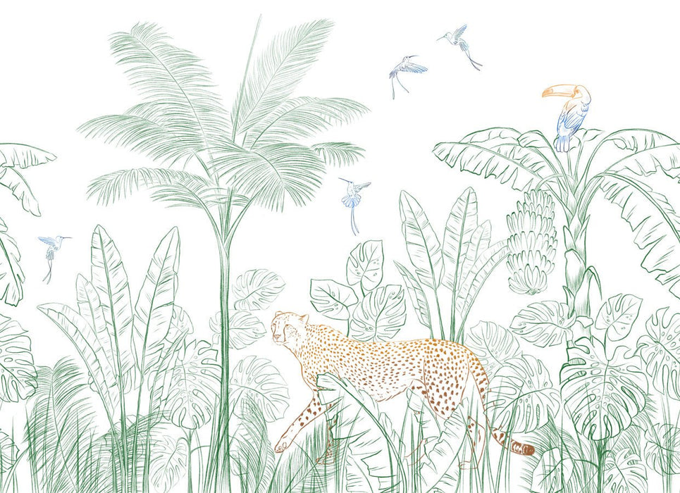 A wild yet contemporary note with our green leopard jungle wallpaper. A pure jungle motif, drawn with green lines, revisited to bring chic and refinement to your interior. Jungle-style wallpaper is ideal for bedrooms, living rooms and entrances. With this mural, you'll create a tropical atmosphere. This jungle wallpaper goes perfectly with wood, rattan and bamboo decorative objects.