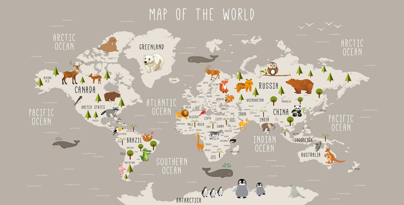 This taupe Animals illustrated world map wallpaper is perfect for playfully decorating a child's bedroom. The pastel colors and animals of the world will give a soft style, and an atmosphere conducive to relaxation. A superb visual ensemble to fascinate and entertain children. Easily create a playful, childlike decor with this custom-made wallpaper! Your wall decor is printed on a waterproof wallpaper with a shiny silky fabric effect.