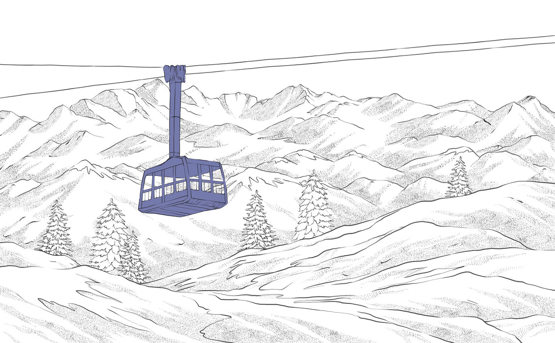 This predominantly black and white wall design, with a blue gondola, features mountains, snow, fir trees and a gleaming gondola. Gain height with your new made-to-measure wallpaper. Opt for an original decoration with a blue decorative element.