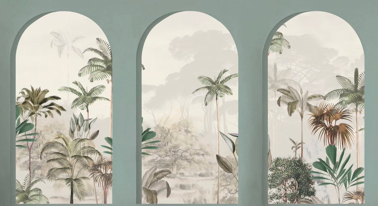 The majestic arches seem to invite exploration amid lush, verdant nature. Exuberant foliage and tropical plants populate every nook and cranny, adding a touch of freshness and life to your wall decor. Let yourself be transported to a world where lush greenery creates a soothing, inspiring atmosphere.