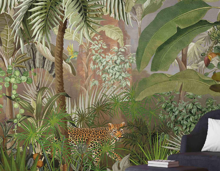 Immerse yourself in a captivating universe with our panoramic jungle & leopard wallpaper. This wall fresco with exceptional motifs will transform your interior and make it sublime. Give your interior a refined touch with this panoramic wallpaper featuring stunning patterns! Banana trees, palm trees, jungle animals, dense nature... A mural creation that's sure to impress your friends.