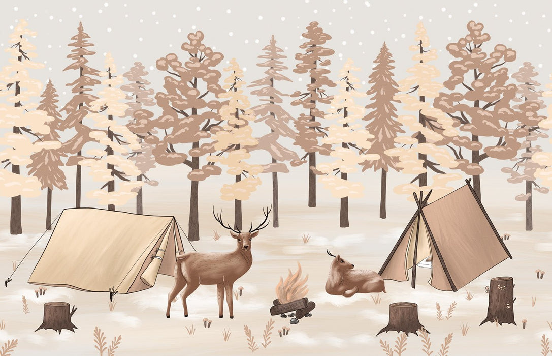 Snow-covered fir, majestic deer, magical campfire, this Scandinavian Swedish fairytale children's wallpaper takes us into a dream world. This mural-like wallpaper is artistic, magical and fairytale-like. The colors of this panoramic tapestry are soothing. Softness, tenderness and escapism.