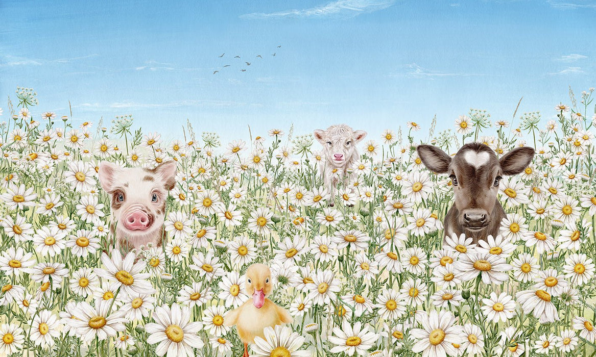 Share new adventures with our new sweet meadow baby wallpaper. A natural children's wallpaper that reminds us of the simple joys and beauties of nature: a flowering field of daisies, blue skies and happy animals. With this children's wallpaper, your wall decor will be as close to nature as possible. A child's bedroom or a baby's room will be sublimated by an original, childlike fresco that will evolve with your child.