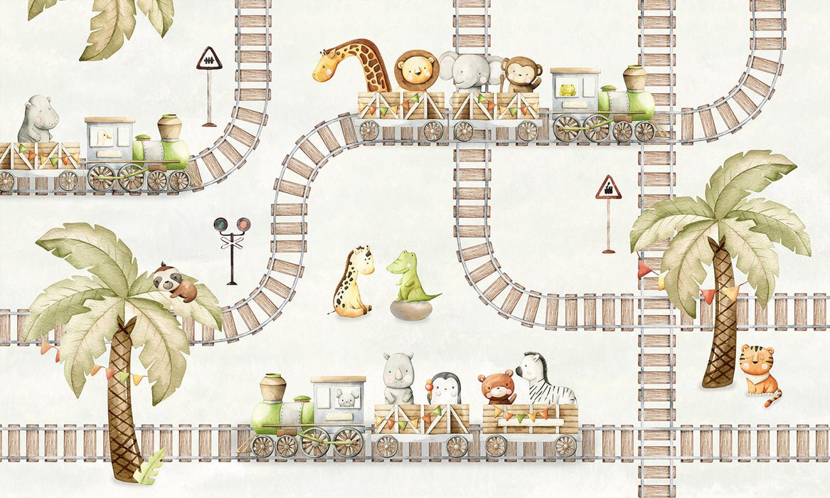 Tchou-Tchou's baby travel wallpaper offers you a new kind of wall decoration: the train track on the wall! Don't bother with a circuit mat, and opt for our new wallpaper! With its little cars and figures, your child will have a huge play area! This fun baby wallpaper is ideal. The soft pastel colors of this wallpaper soften the atmosphere in his room. Let's join the cute animals and travel the world together.