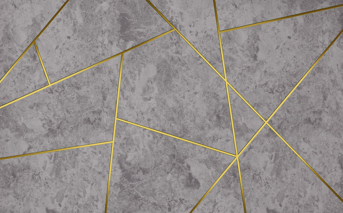 This wallpaper has a textured trompe l'oeil effect, featuring a grey concrete marble effect, accompanied by gold-effect lines. This wallpaper does not contain gold ink, but a mixture of yellow, orange and brown tones, which gives it this effect.