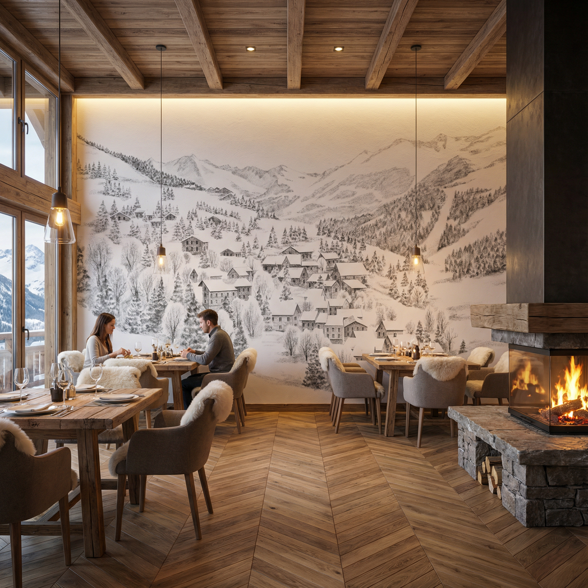 Parfait comme papier peint hôtel, papier peint chalet ou papier peint montagne professionnel, il valorise les halls d’accueil, salons, lobbys, suites et espaces lounge en offrant une immersion visuelle raffinée et intemporelle. Il est également adapté aux intérieurs des particuliers dans un couloir, une chambre ou un salon pour apporter un atout déco personnalisé