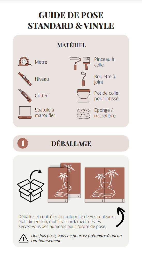 If you've ordered a custom panoramic wallpaper printed on SOFT TOUCH or VINYLE PRO non-woven backing, click on the image to download the installation guide to help you install your new wallpaper.