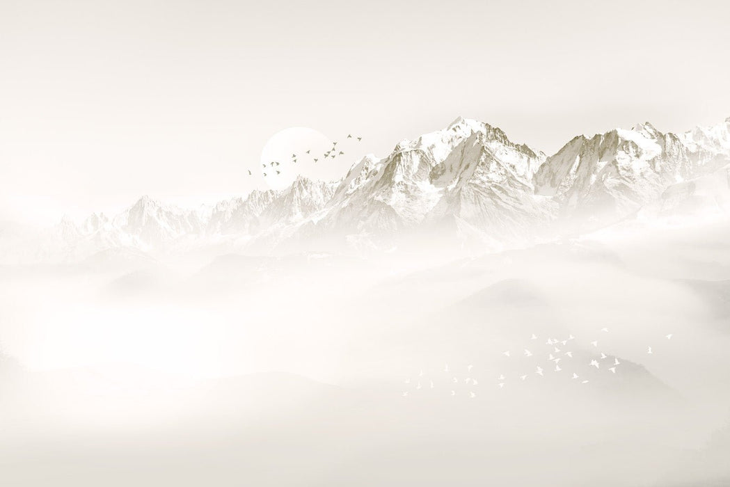 This exceptional landscape wallpaper offers total immersion in a natural, misty setting, evoking the first moments of a peaceful morning facing Mont Blanc. The atmosphere is both soothing and exotic, ideal for creating a space of well-being at home.